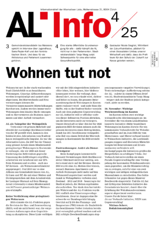 Das AL-Info 4/25 widmet sich dem Thema öffentliche Grundversorgung. Stadtratskandidatin Tanja Maag setzt Schwerpunkte für eine alternative Gesundheitspolitik. Ausserdem spricht Gemeinderatskandidatin Isa Maiorano im Interview über Jugendhaus, Sans-Papier-Kafi und den feministischen Streik und Niggi Scherr zeichnet im Leitartikel die wohnpolitischen Kämpfe der AL nach.