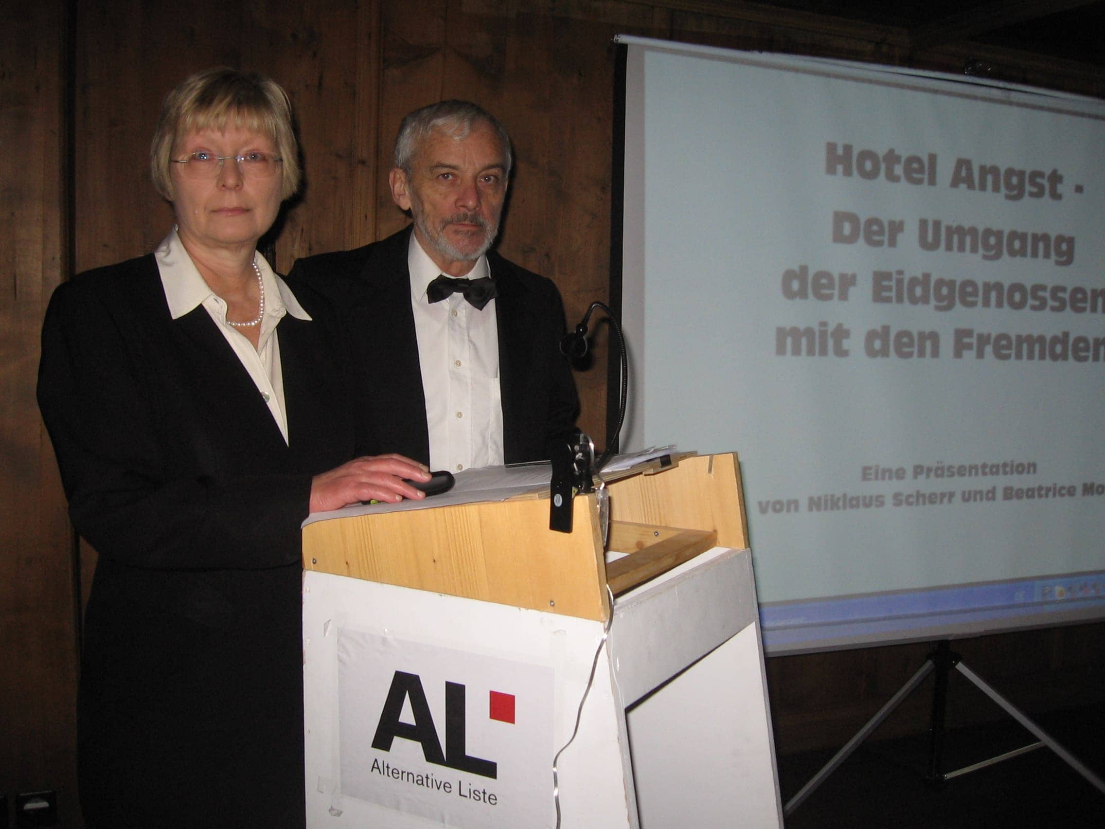 Um das niederschmetternde Ergebnis der Minarett-Abstimmung aufzuarbeiten, hat AL-Gemeinderat Niggi Scherr zusammen mit Beatrice Moll Anfang 2010 die Performance „Hotel Angst – Der Umgang der Eidgenossen mit den Fremden“, ein politisch-literarisches Potpourri aus 150 Jahren Schweizergeschichte, lanciert. Nach zwei erfolgreichen Präsentationen in Zürich gehen die beiden jetzt auf Tournee im ganzen Kanton.