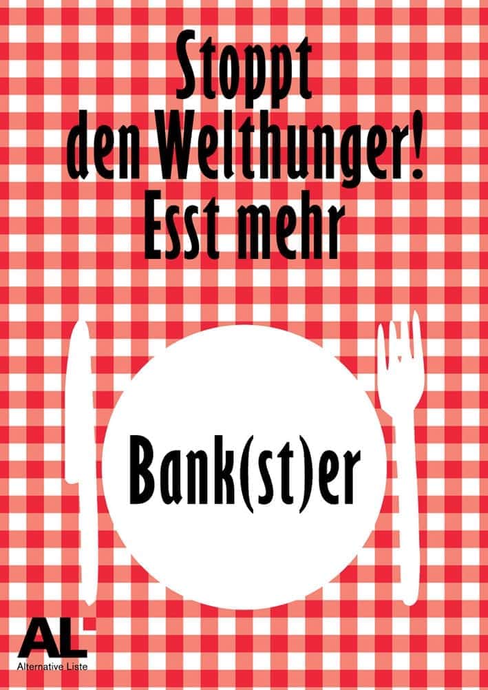 Die Alternative Liste Zürich unterstützt die Bewegung „Occupy-Paradeplatz“ und wird an dieser friedlichen Besetzung teilnehmen. Protokoll der Vorbereitungssitzung vom 10. Oktober (PDF) Artikel von Niklaus Scherr zur aktuellen Bankenkrise auf Politnetz Stoppt den Welthunger, Plakat (JPG) Stoppt den Welthunger, Plakat (PDF)