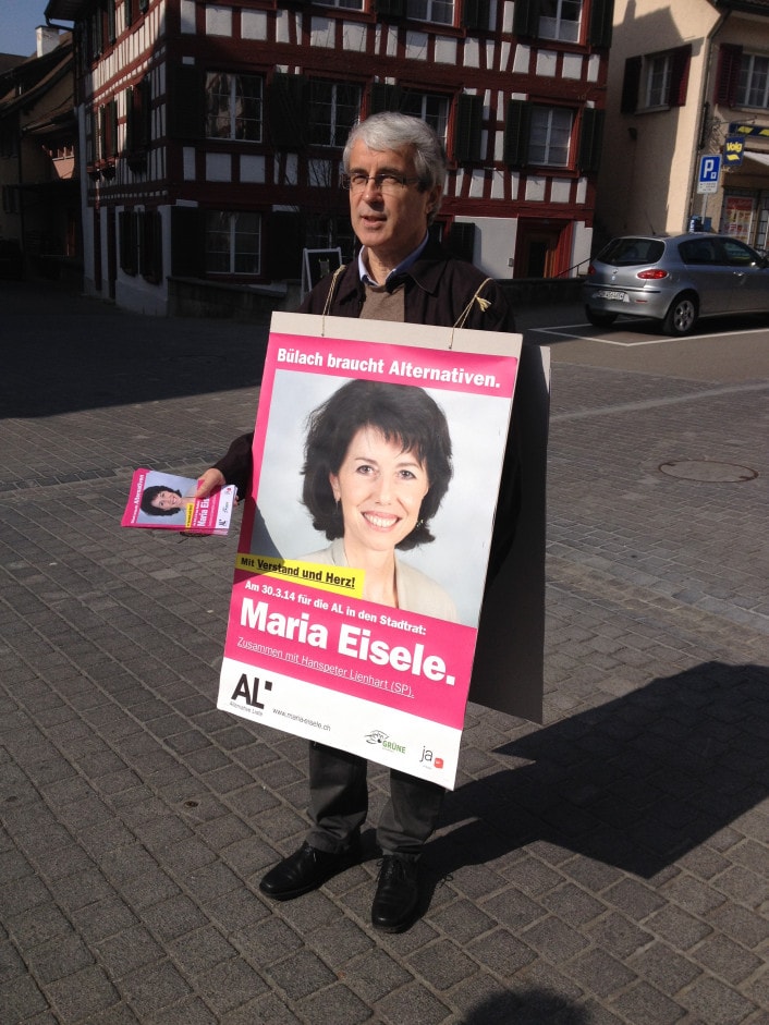 Mehrere Sandwichfrauen und -männer mit dem Maria-Eisele-Plakat waren unübersehbar präsent und verteilten vor dem Migros, in der Altstadt und vor dem Markt den interessierten Passantinnen und Passanten Wahlflyer und die Wahlempfehlung “Das Wunder von Bülach”.