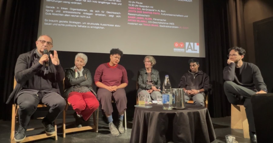 Das Gespräch mit TABEA RAI (Alt-Grossrät:in AL, Bern), JOVITA DOS SANTOS PINTO (Kulturwissenschaftlerin und Rassismusforscherin), SAMIR JAMAL ALDIN (Filmemacher) und ARTAN ISLAMAJ (Co-Geschäftsführer INES) führte uns in eine postmigrantische Realität, eine Realität, in welcher Migration nicht mehr als Ausnahme verstanden werden sollte. In dieser Gesellschaft sind Migrant:innen in Organisationen und Parteien vertreten, weil Parteien postmigrantische Karrieren verstehen.