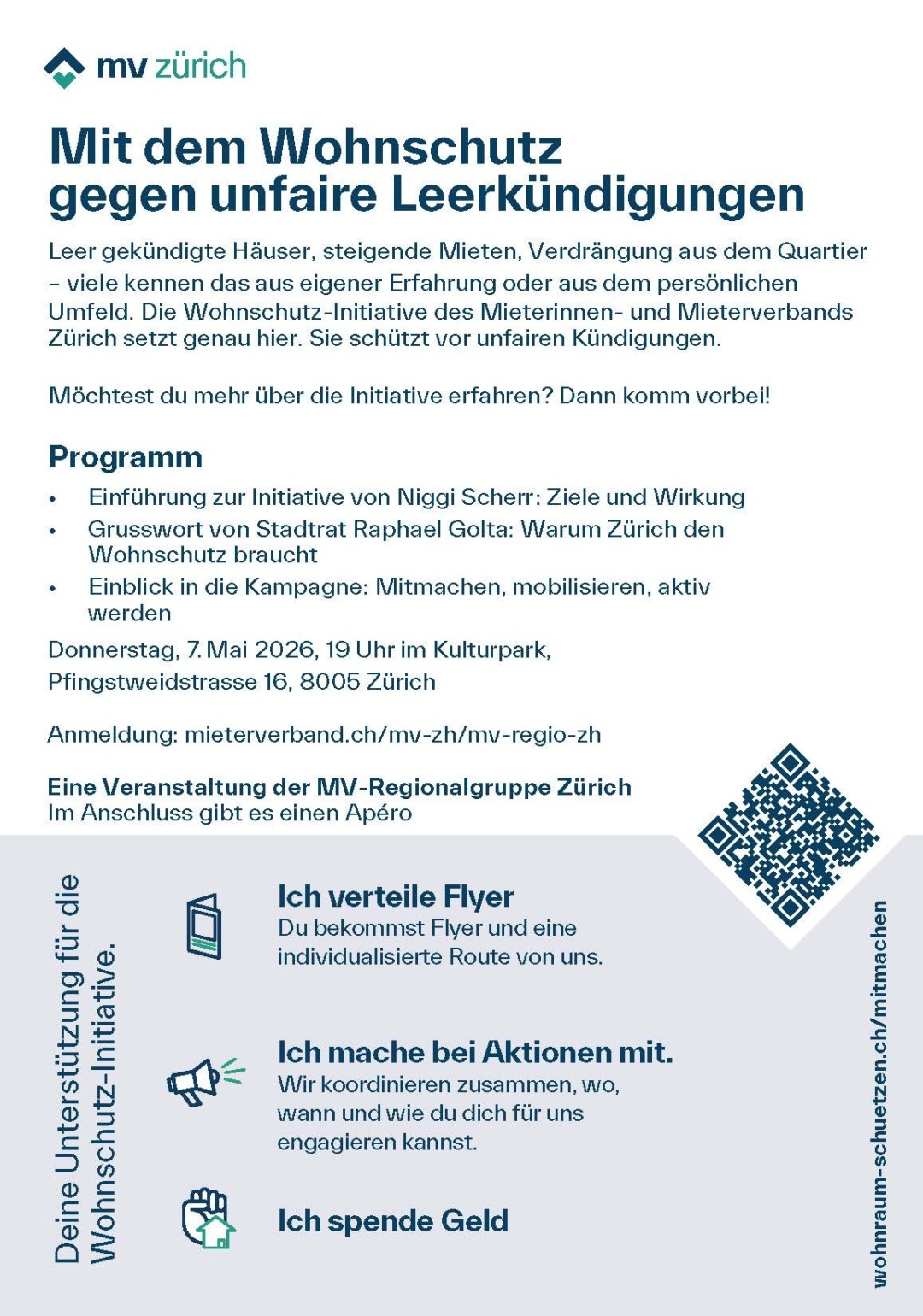 Am 7. Mai stellt Alt-Gemeinderat Niggi Scherr die Wohnschutz-Initiative des Mieterinnen- und Mieterverbands vor. Im Kulturpark um 19 Uhr. Informiere Dich, mach mit, werde aktiv!